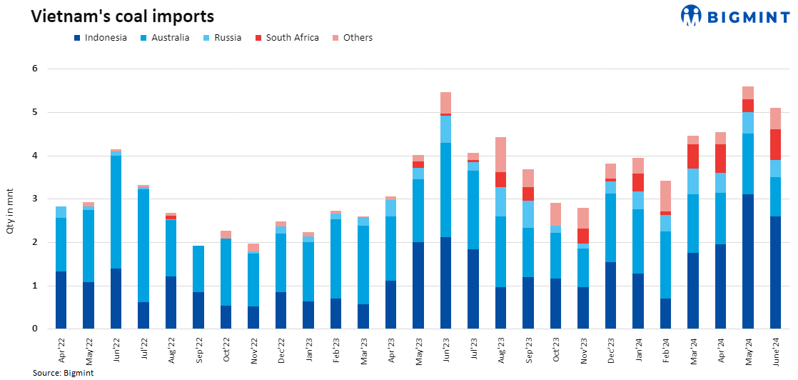 • Vietnam’s coal (coking, non-coking and met coke) imports rose by 40% y-o-y in H1 CY’24 to 27.3 mnt against 19.4 mnt in H1 CY’23, as per data collated by BigMint.