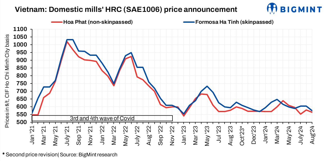 Vietnamese steel major, Formosa Ha Tinh, has reduced hot rolled coil (HRC) prices by $30/tonne (t) m-o-m for August 2024 shipments. Prices fell amid declined imported HRC offers as well as competitive prices from both domestic and global competitors. Subsequent to the revision, prices of HRCs (SAE1006, skin pass) stand at around $570-580/t CIF Ho Chi Minh City (HCMC). Meanwhile, non-skin pass coils are at around $565-575/t CIF, sources informed BigMint.