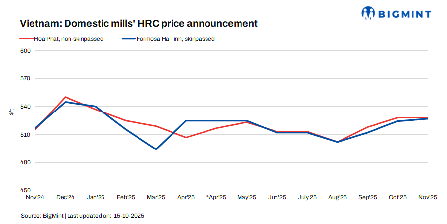 Vietnamese steel giant Formosa Ha Tinh (FHS) has increased its hot-rolled coil (HRC) prices by approximately $3/tonne (t) m-o-m for November 2025 sales. Following this adjustment, FHS’s HRC prices (SAE1006, skin-passed) ranged within $522-$532/t CIF Ho Chi Minh City (HCMC), depending on the quantity booked, as compared to $519-528/t CIF HCMC last month.
