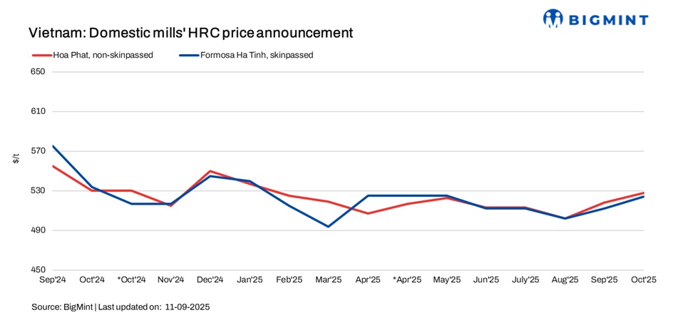 Vietnamese steel giant Formosa Ha Tinh (FHS) has increased its hot-rolled coil (HRC) prices by approximately $12/tonne (t) m-o-m for October 2025 sales. Following this adjustment, FHS’s HRC prices (SAE1006, skin-passed) ranged within $519-528/t CIF Ho Chi Minh City (HCMC), depending on the quantity booked, as compared to $507-517/t CIF HCMC last month.