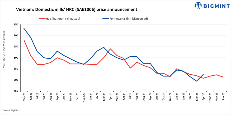 The Hoa Phat Group has decreased its monthly HRC (SAE1006, non-skin-passed) prices by around $8/t for Jun’25 shipments. Post-revision, prices are approximately $515/t or VND 13,315,724 /t against $517-$523/t for the southern region in May’25, excluding VAT. The decline in HRC prices is attributed to weak market sentiment and subdued demand in Vietnam.
