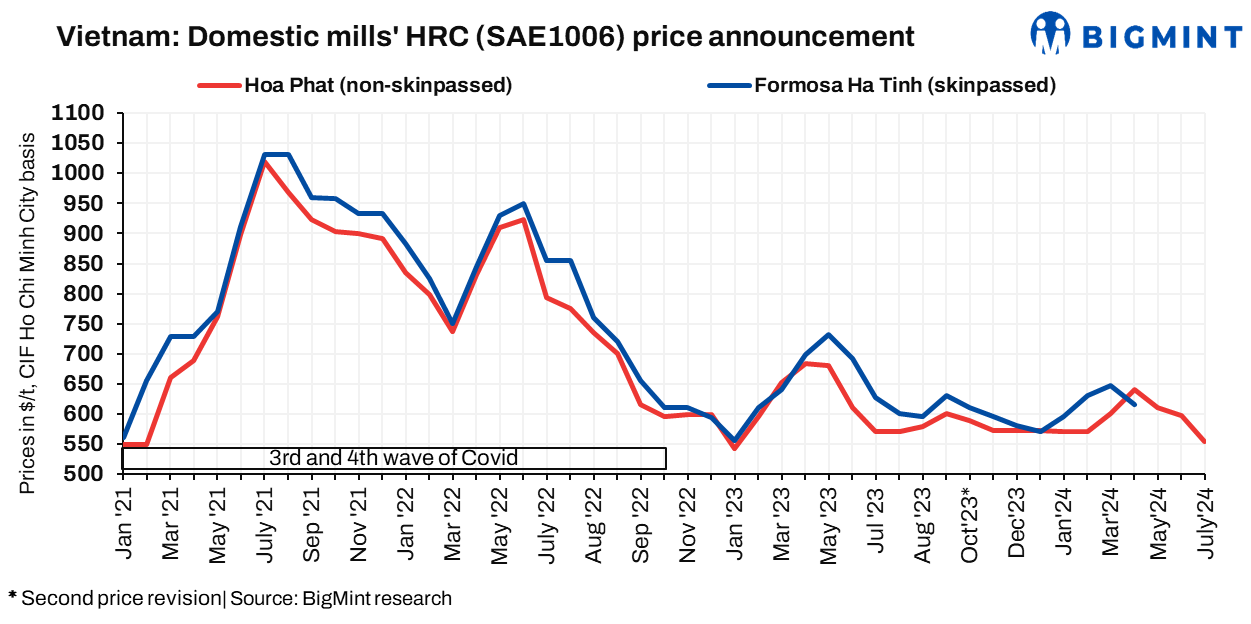 Vietnamese integrated steel manufacturer, Hoa Phat, has lowered its monthly HRC (SAE1006, non-skinpassed) prices by $40-45/t for June-July’24 sales, sources informed BigMint. Post-revision, the effective prices stand at $553/t or VND 13,740,000/t, excluding VAT. Lower exports, sluggish domestic construction activity, and recent weakening of imported HRC offers have all contributed to the price drop.