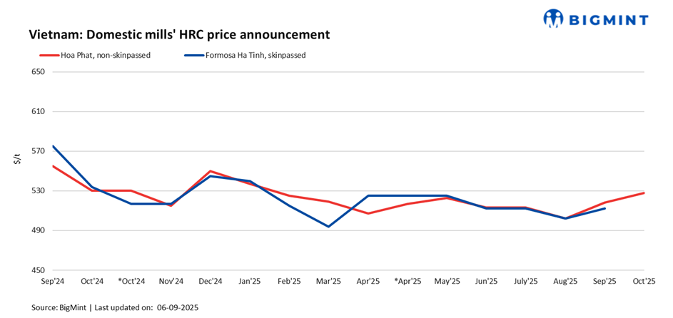 The Hoa Phat Group has increased its monthly HRC (SAE1006, non-skin-passed) prices by approximately $10/t m-o-m for Oct’25 sales. Post-revision, prices in the southern region were at around $528/t or VND 13,930,000/t as compared to $518/t a month ago, excluding VAT. The price hike is attributed to improved market sentiment in Vietnam.