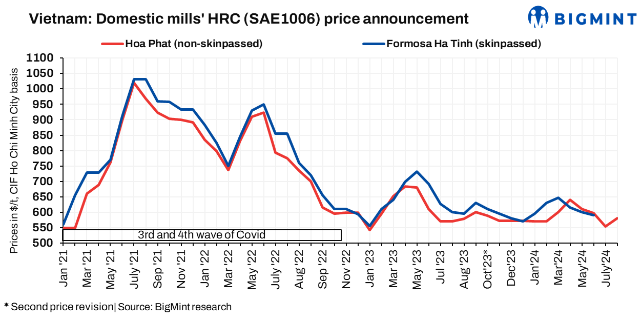 Hoa Phat has increased its monthly HRC (SAE1006, non-skinpassed) prices by $27/t for July’24 sales, sources informed BigMint. Post-revision, effective prices stand at $580/t or VND 14,670,000/t for Southern region, excluding VAT. Prices rose amid higher domestic prices from competition as well as improved Chinese import offers before Labour Day holidays.