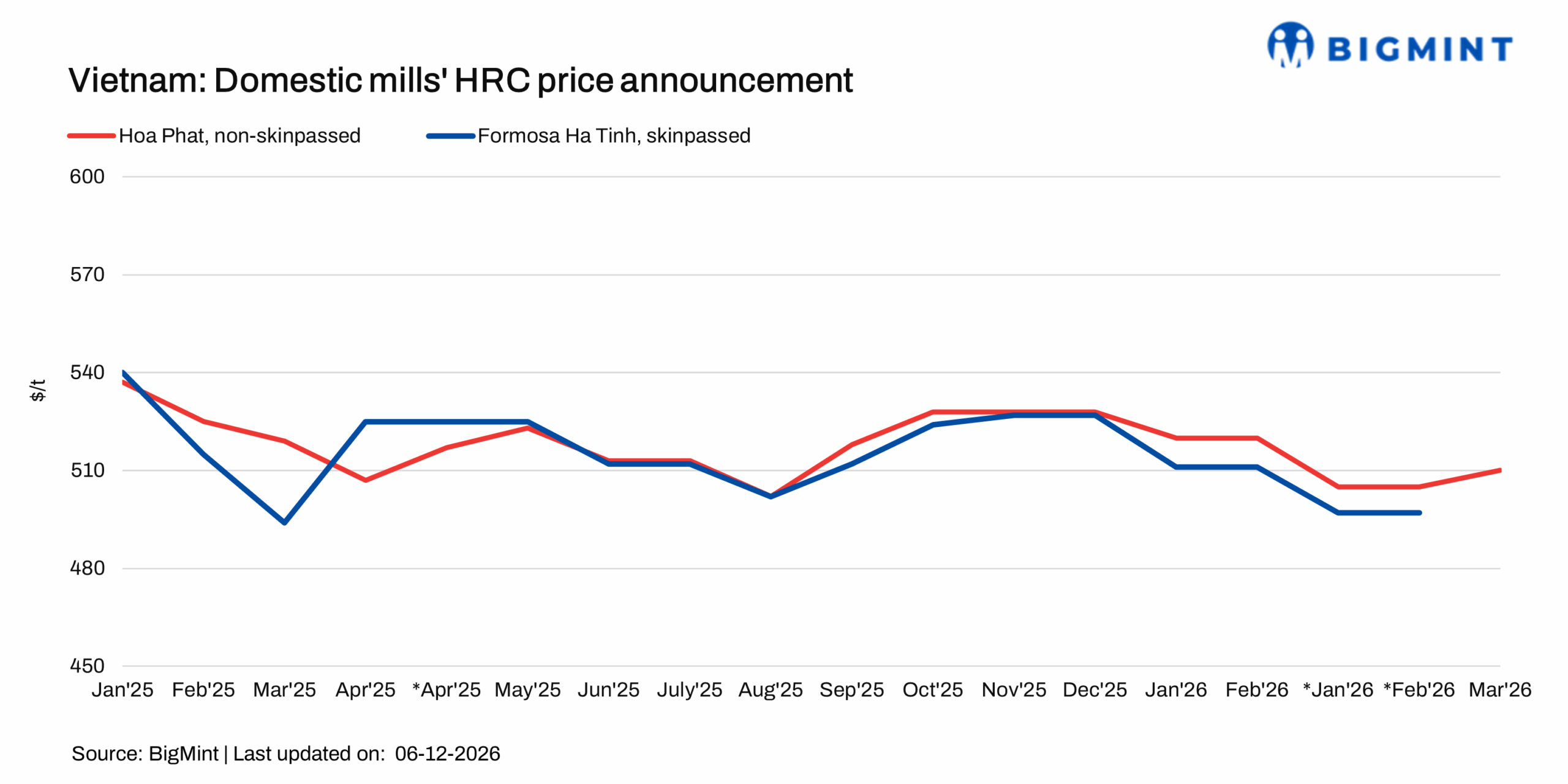 Vietnamese steel major, Hoa Phat Group, has raised its HRC (SAE1006, non-skin-passed) prices for Feb-Mar’26 sales by $4/t m-o-m. Following the revision, prices in the southern region stood at $510/t (VND 13,420,000/t), up from $506/t (VND 13,320,000/t) a month earlier, excluding VAT. The price hike reflects improved market sentiment in Vietnam.