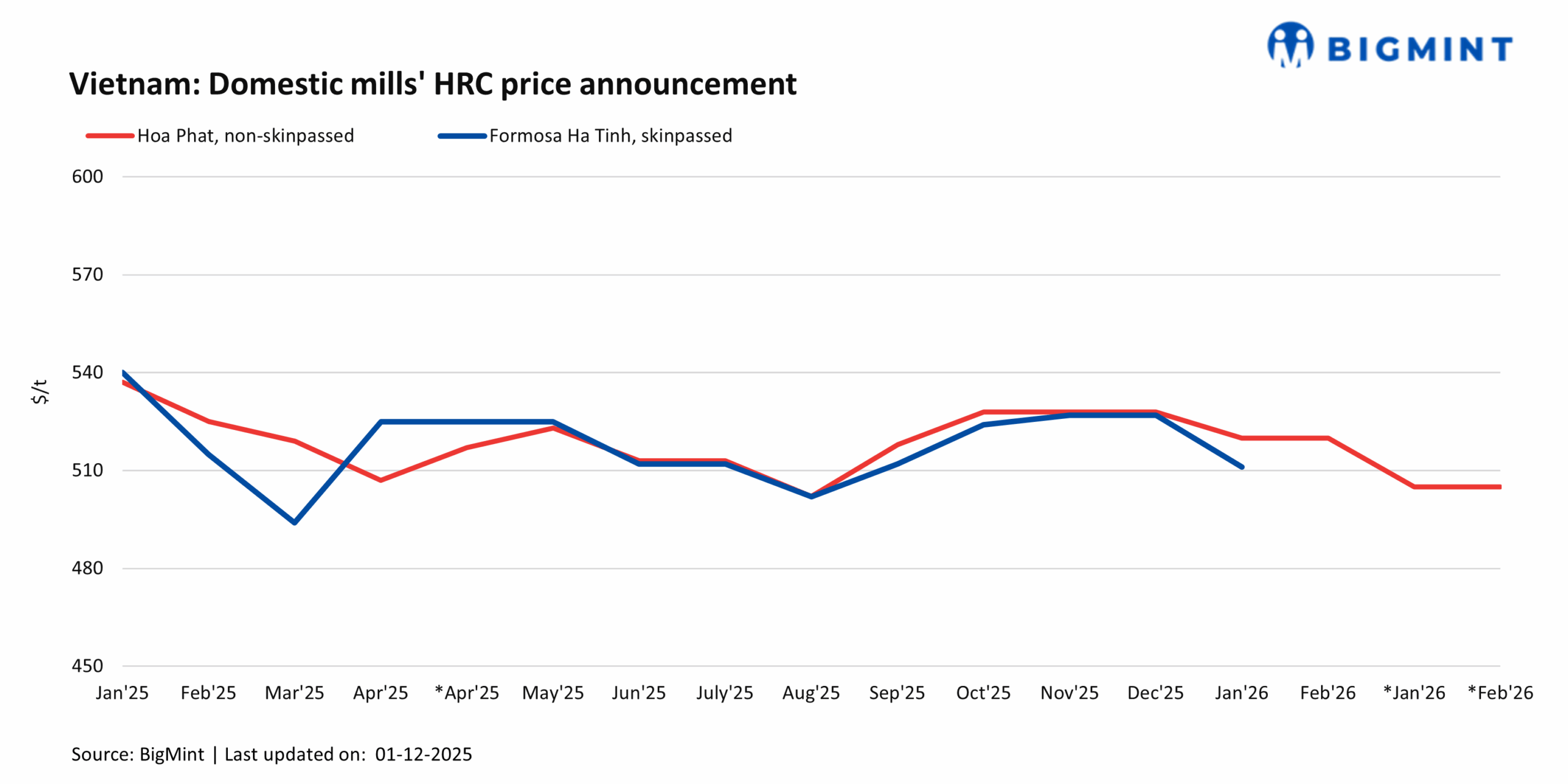 Vietnamese steel major Hoa Phat Group has further reduced its HRC (SAE1006, non-skin-passed) prices for Jan-Feb’26 sales by $15/t m-o-m. Prices were revised downward against levels previously announced on 3 Nov. Revised prices in the southern region stood at $505/t (VND 13,320,000/t) against $520/t (VND 13,680,000/t), excluding VAT. The price cut stems from muted demand and cautious sentiment in Vietnam amid adverse weather.