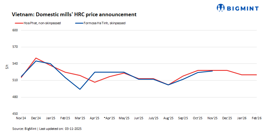 Vietnamese steel major Hoa Phat Group has decreased its HRC (SAE1006, non-skin-passed) prices by $8/t m-o-m for Jan-Feb’26 sales after keeping them stable for Nov’25 sales. Post revision, prices in the southern region stood at $520/t or VND 13,680,000/t against $528/t or VND 13,943,756/t, excluding VAT. The decline in HRC prices is attributed to weak market sentiment and subdued demand in Vietnam.