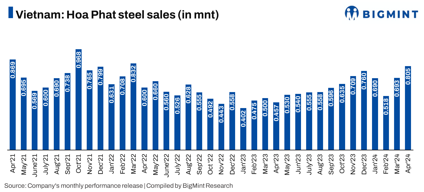 Hoa Phat, Vietnam’s largest steelmaker, produced 738,000 t of steel in Apr’24, a slight decrease against 741,000 t a month ago. Whereas, sales of steel billets, construction steel and HRC products rose by 16% m-o-m to 805,000 t in Apr’24 as compared to 693,000 t in Mar’24. In four months, Hoa Phat exported 952,000 t of steel, diversifying sales and offsetting slow domestic market.