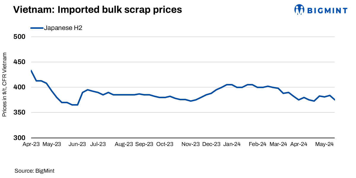 BigMint’s weekly assessment for Japanese H2 scrap was reportedly in the range of $370-375/t CFR Vietnam, down by $8/t w-o-w from last week’s $383/t, whereas buyers were aiming for $366-368/t CFR Vietnam.