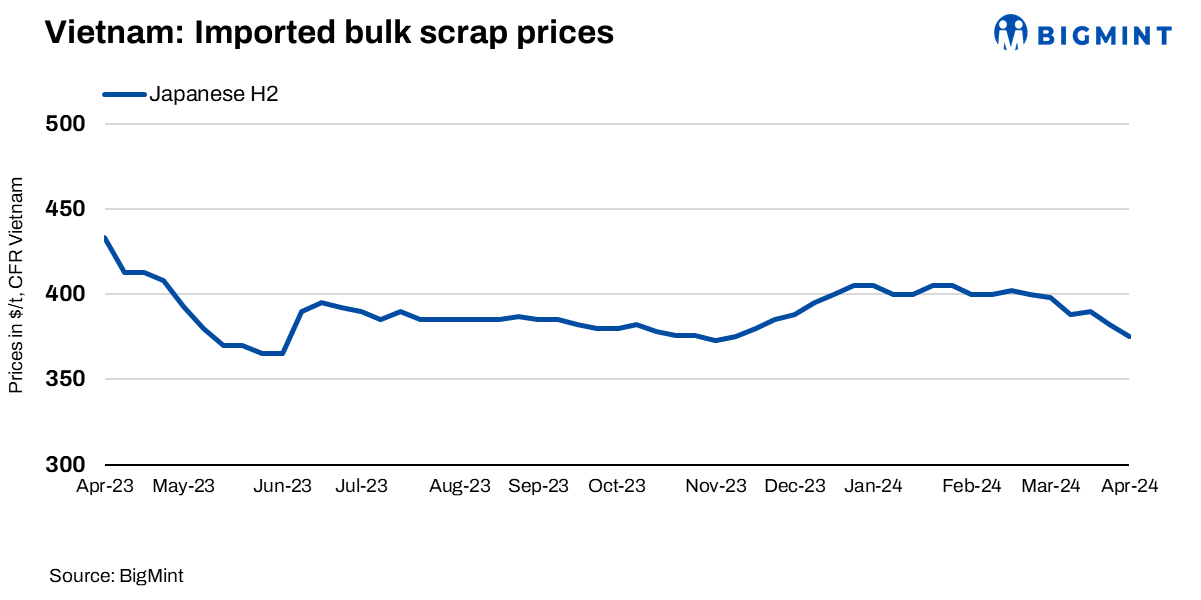 - BigMint’s weekly assessment for Japanese H2 scrap was reportedly in the range of $375-380/t CFR Vietnam, down by $7/t w-o-w from last week’s $382/t, whereas buyers were aiming for $365-368/t CFR Vietnam.