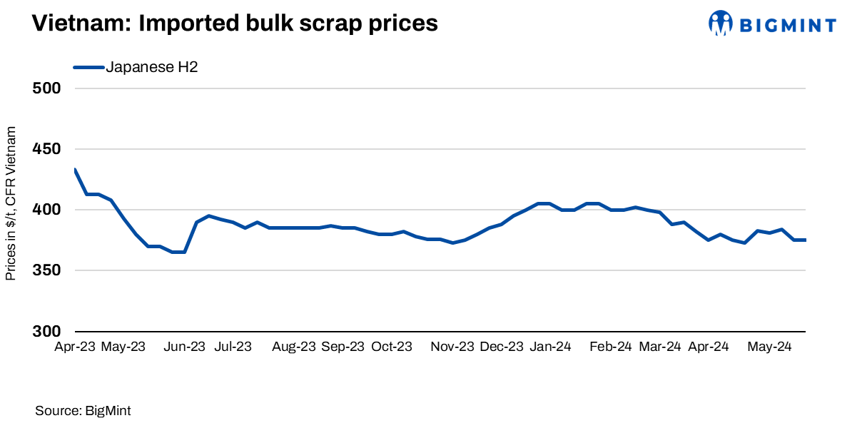 BigMint’s weekly assessment for Japanese H2 scrap was reportedly in the range of $372-375/t CFR Vietnam, unchanged w-o-w.