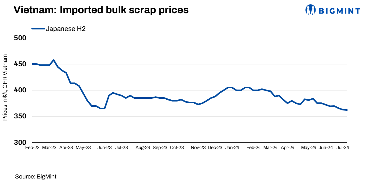 - Weekly assessment for Japanese-origin H2, a major tradable grade in Vietnam’s scrap market, declined by $1/t to $362/t CFR Vietnam; with workable levels still at $356-358/t levels.