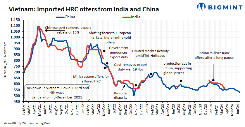 China’s hot-rolled coil (HRC) export offers to Vietnam dropped by $5/t w-o-w to $525-530/t CFR against $530-535/t CFR HCMC. A deal of around 10,000 t of HRCs has been heard concluded at $525/t CFR HCMC for Aug’24 shipment. Moreover, China’s SHFE HRC futures dropped by RMB 16/t ($2/t) to RMB 3,734/t ($514/t) w-o-w, the same fell by RMB 42/t ($6/t) d-o-d.