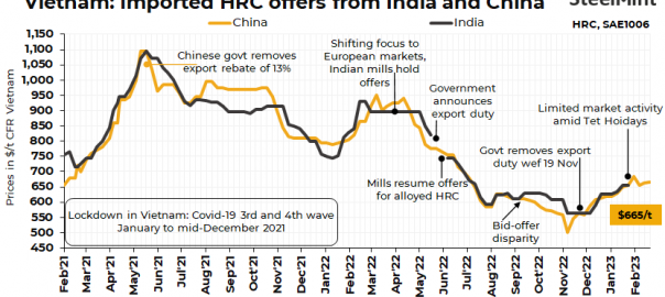Formosa hikes prices more than expected: Steel major Formosa Ha Tinh has increased HRC (SAE1006, skinpass) prices by $59/t m-o-m to $699/t CIF Ho Chi Minh City (HCMC) for April and early May 2023 sales last week. However, market participants had anticipated it to be around $685/t CIF.