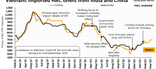 Vietnam mills are likely to quote higher offers in the domestic market amid improved  overseas market sentiments. On a monthly average basis, Chinese HRC (SAE1006) offers have increased by about $30/t m-o-m to $705/t CFR Vietnam so far in March 2023.