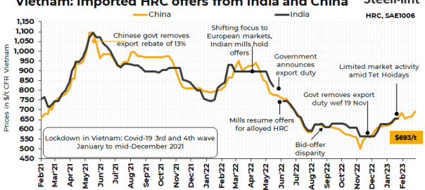 Vietnamese buyers dry-up domestic supplies at higher prices: The domestic steel major, Formosa Ha Tinh, has exhausted its allocations for April and early-May 2023 sales despite a price increase of $59/t m-o-m to $699/t CIF Ho Chi Minh City (HCMC), informed some local trade sources. This shows an improved demand in the country and expectation of further hikes in the upcoming weeks.