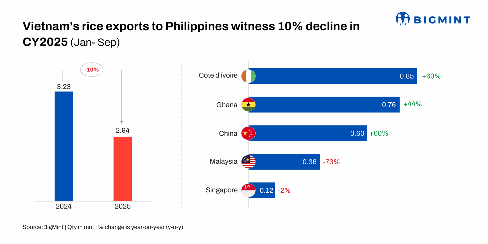 In contrast, demand from key ASEAN partners softened. Malaysia’s imports plunged to 3.6 million tonnes from 6.2 million tonnes a 73% y-o-y decline as the country pushes for rice self-sufficiency and explores cheaper alternatives while local output improves. Singapore edged down marginally to 1.21 million tonnes from 1.24 million tonnes, a 2% drop as per BigMint data.
