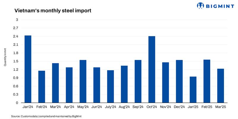 Notably, Vietnam’s steel imports decreased by 21% to 1.23 million tonnes (mnt) in March 2025 as compared to 1.56 mnt in February. Moreover, on a y-o-y basis, the same declined by 14% y-o-y from 1.43 mnt in March 2024. Furthermore, steel imports from China to Vietnam in March 2025 stood at 0.71 mnt, down by 30% against 1.01 mnt in February. Additionally, the same dropped by 29% y-o-y as of 1 mnt in March 2024.