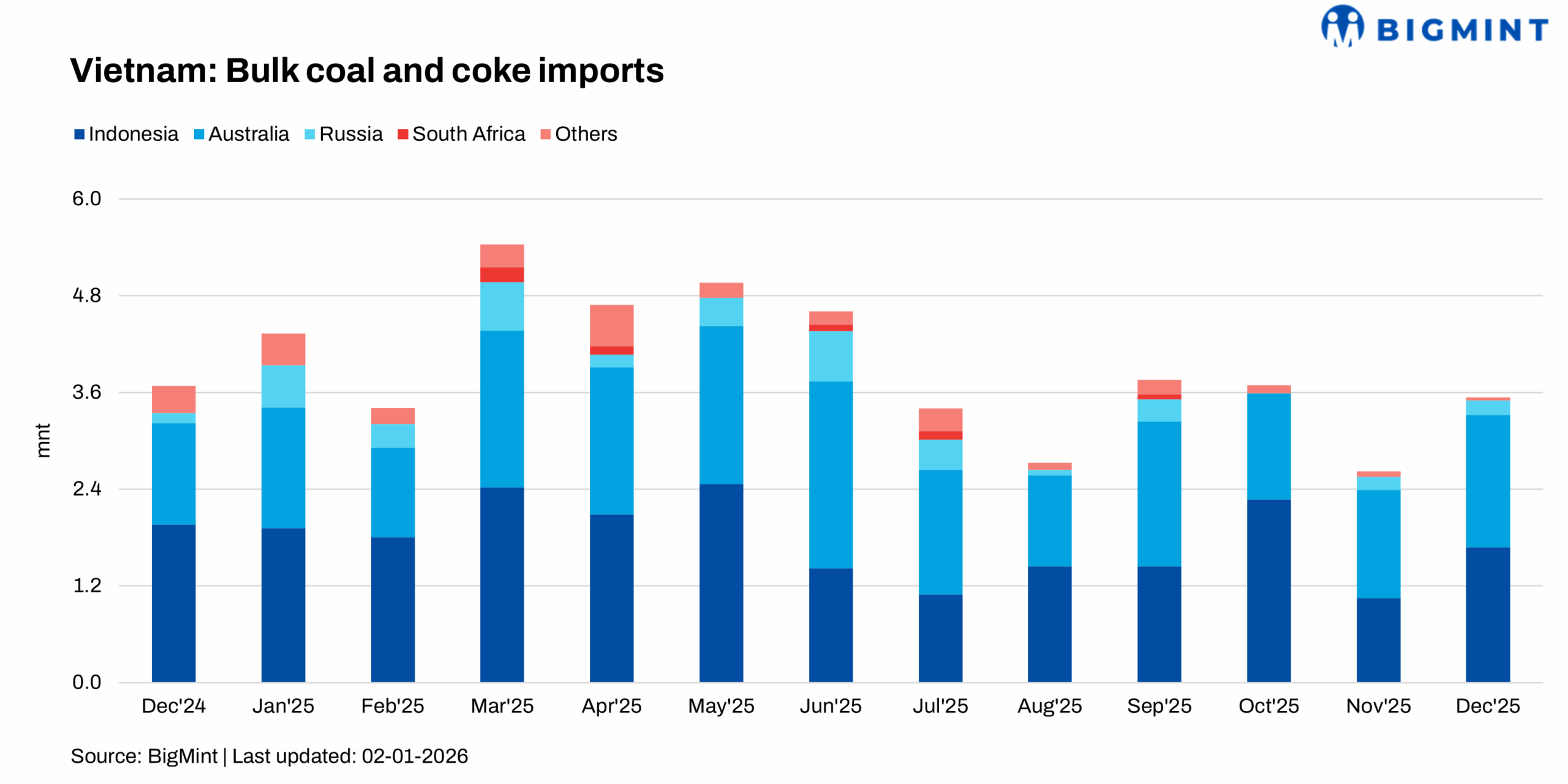 Vietnam’s bulk imports of coal and coke (including coking and non-coking coal and metallurgical coke) stood at 3.54 mnt in Dec’25, up 34.8% m-o-m from 2.62 mnt in Nov. On a y-o-y basis, imports recorded a drop of 3.9% from 3.7 mnt in Dec’24. Total imports in CY’25 stood at 47.2 mnt, decreasing by 9.6% compared to CY’24. Indonesia emerged as the largest exporter at 21.1 mnt in CY’25.