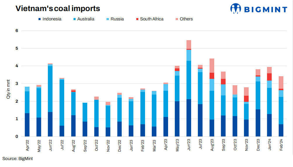Vietnam’s coal imports drop by 13% m-o-m to 3.41 mnt in Feb’24 as against 3.94 mnt in Jan’24. Imports surged 25% y-o-y as compared to 2.72 mnt in Jan’23. Australia (up by 5%) was the largest exporter at 1.55 mnt, followed by Indonesia at 0.70 mnt (down 45% m-o-m) and Japan at 0.10 mnt. Moreover, Imports from South Africa drop by 82% to 0.08 mnt in the month under review.