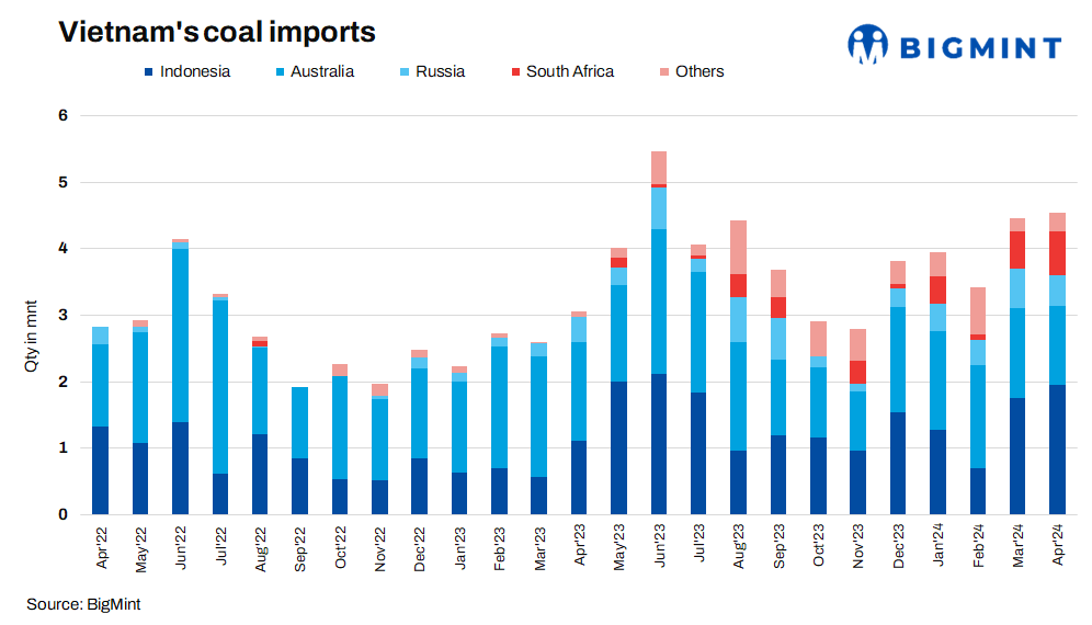 Vietnam’s coal imports increased by 2% m-o-m to 4.53 mnt in Apr’24 as against 4.46 mnt in Mar. Indonesia was the largest exporter at 1.96 mnt, up 11%. Australia’s coal exports to Vietnam dropped by 12% at 1.18 mnt as against 1.34 in Mar’24. while South Africa shipped 0.66 mnt. Moreover, imports from Canada increased significantly to 0.13 mnt in the month under review.