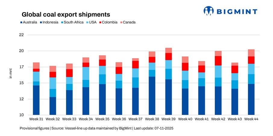 Global seaborne coal exports rose 11.1% w-o-w to 19.84 million tonnes (mnt) in week 44 (25-31 October 2025) from 17.85 mnt in week 43 (18-24 October), according to BigMint’s vessel line-up data. The rebound was led by stronger shipments from Indonesia, Colombia, Canada, and South Africa, while Australia maintained steady throughput.