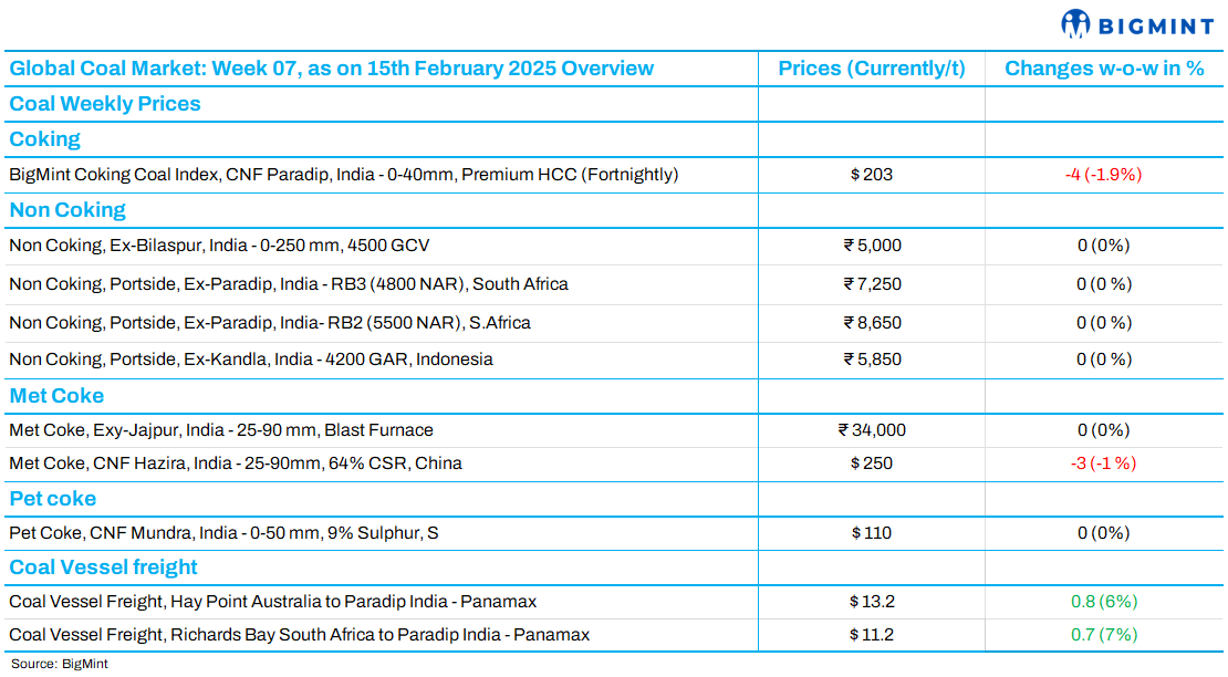 BigMint’s premium hard coking coal (PHCC) index declined to $203/t CNF Paradip on 15 February, down by $4 from the last assessment. Market uncertainty persists, with traders offering at $200/t FOB Australia while buyers remain hesitant. Seasonal disruptions in Australia have lifted offers slightly, with PHCC assessed at $190/t FOB.