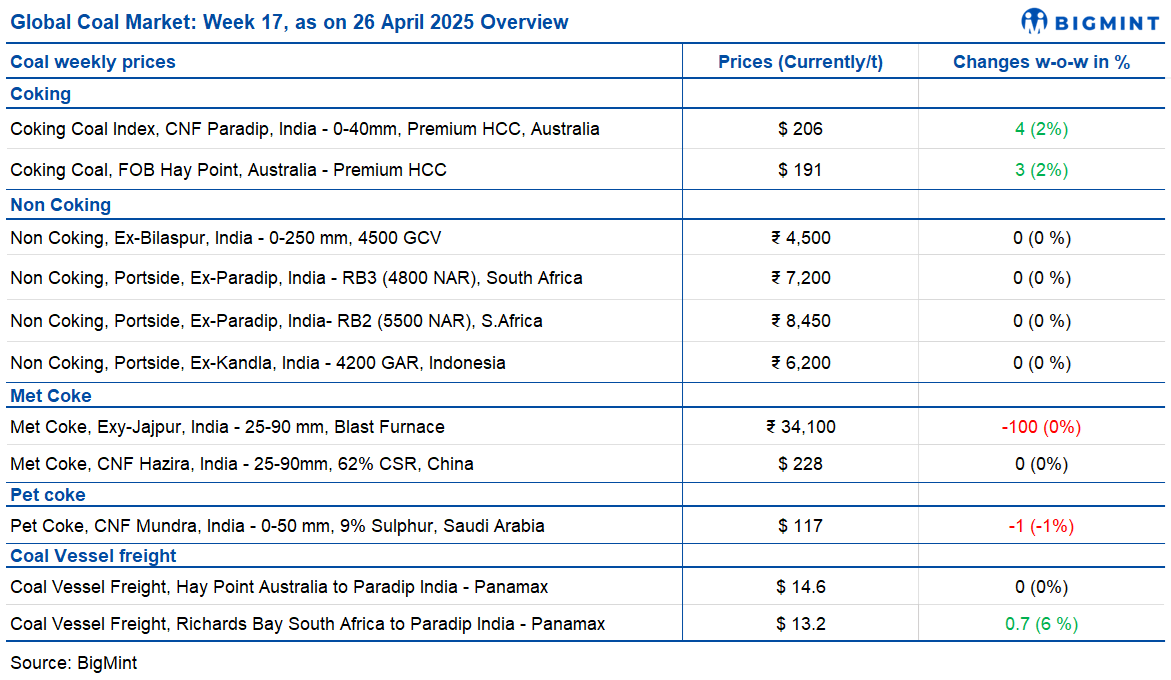 Domestic coal prices in India remained unchanged w-o-w, with 4500 GCV and 5000 GCV coal assessed at INR 4,500/t and INR 4,950/t exw-Bilaspur, respectively. Demand was subdued, with no new buying interest reported. In recent SECL auctions, bid levels stayed close to base prices, reflecting a lack of urgency among buyers. Sellers, however, maintained firm offers, resisting any price cuts. Additionally, the decline in sponge iron prices has added pressure on coal demand. Despite weak market activity, sellers continue to prioritise price stability over volume sales in the current environment.