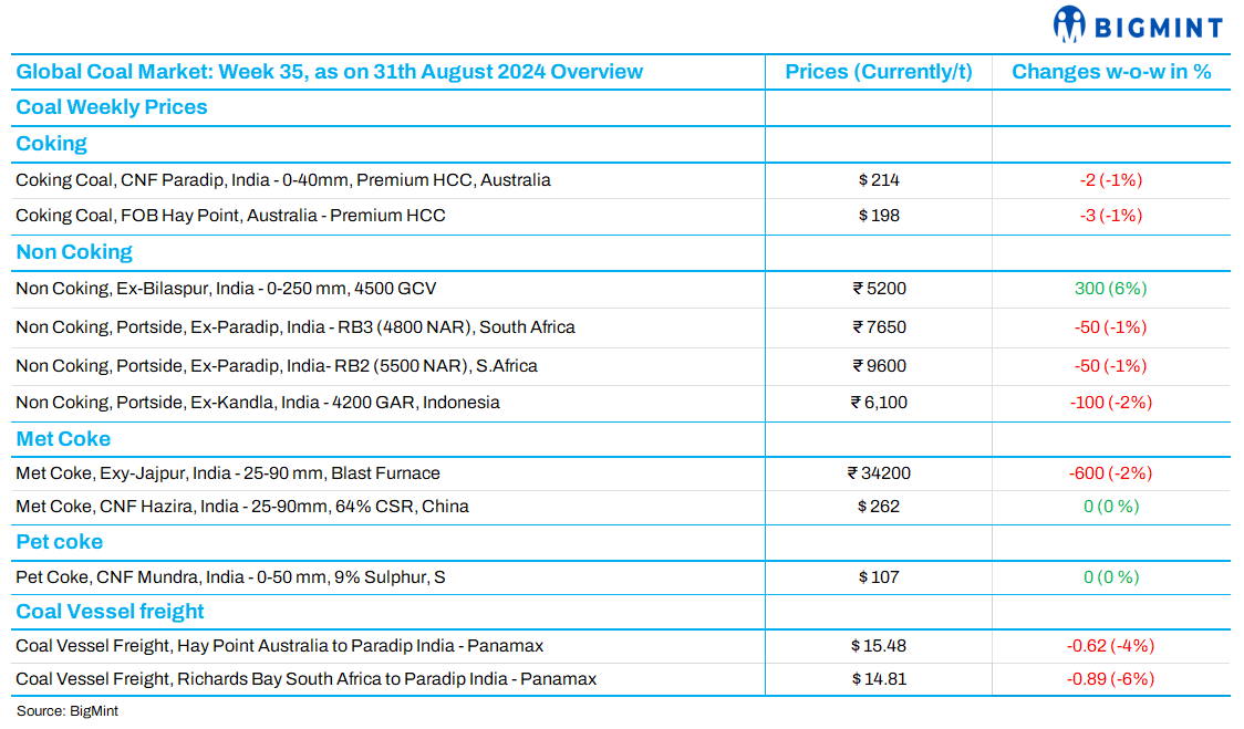 Indonesian and South African thermal coal prices dropped in India due to weak demand, while domestic coal prices rose on seasonal demand. Met coke import prices faced pressure from rising port stocks, leading to declines in domestic prices, compounded by steel price cuts. Imported pet coke prices hit a one-month low.