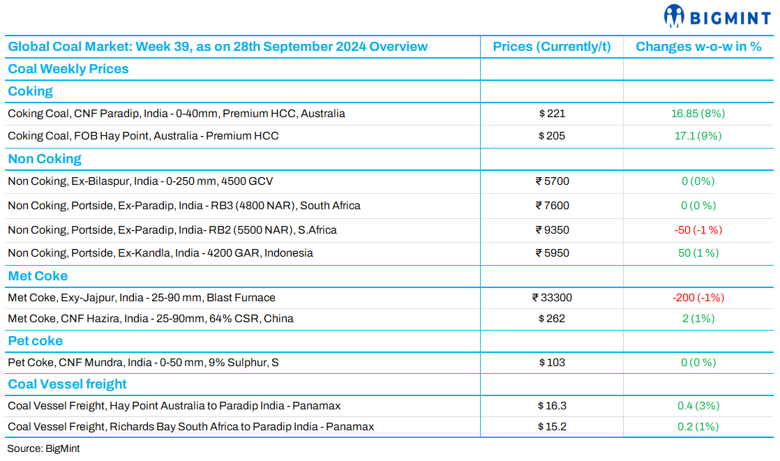 Indonesian thermal coal portside prices remained largely stable this week. In contrast, South African thermal coal prices dipped due to weak demand and high inventories. In India, domestic coal prices held steady amid tight availability, though overall demand remained subdued due to the monsoon. This pressure extended to the domestic met coke market, where prices edged down despite global price hikes. Coking coal prices rose sharply towards the weekend, driven by the Chinese stimulus announcement.