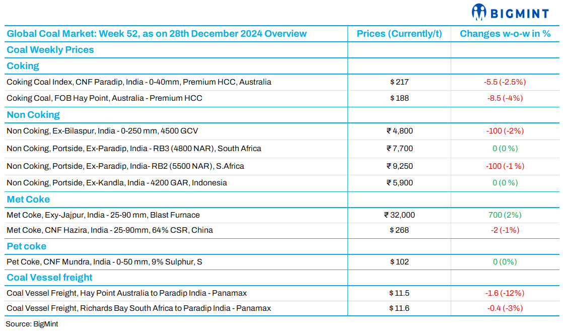 India’s coal market remained sluggish this week weighed down by high inventories, subdued demand and market slowdown ahead of the holiday season. Indonesian portside thermal coal prices held steady amid cautious buying, while South African coal prices weakened amid ample domestic supplies following CIL auctions. Domestic coal prices also dipped, reflecting muted demand from sponge iron producers. In met coke, tightened import restrictions and higher domestic offers signalled market strength. Meanwhile, pet coke prices stayed stable, with minimal trading activity reported.