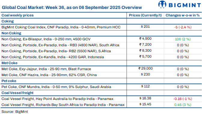 This week, India’s coal market showed a cautious undertone. Domestic coal prices edged higher for key grades, but the impact of GST revision to 18% and INR 400/t cess removal remained uneven across segments. South African and Indonesian portside markets stayed mostly steady, with sellers focusing on stock liquidation before the 22 September GST deadline. Imported pet coke offers held stable as buyers waited for clarity post-tax change. Dry bulk freight trends stayed mixed, with firm bunker costs supporting short-haul routes. Overall, market activity stayed subdued amid muted demand, with trade participants adopting a wait-and-watch approach.
