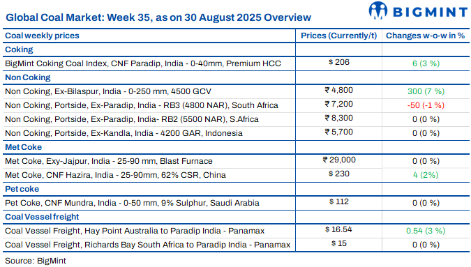 BigMint’s PHCC index rose by $6/t w-o-w to $206/t CNF Paradip on 29 Aug’25, even as trade remained thin. Australian offers eased by $5/t, with market chatter placing quotes at $215-218/t CFR India, while buyers view $200-205/t as workable. A miner reportedly sold 75,000 t GYC cargo at $189/t FOB Australia, though Indian participants pegged tradable levels closer to $185-186/t FOB. Met coke prices in India held steady amid tight domestic supply, while Chinese curbs kept regional sentiment mixed. With steel under pressure, coking coal tags may face resistance despite limited supply support.