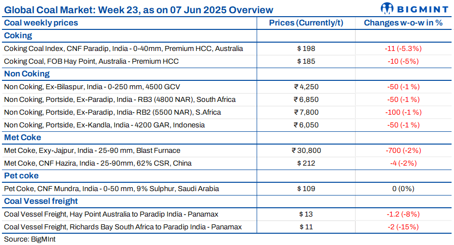 India’s coal market remained under pressure amid sluggish demand, early monsoon disruptions, and high inventories. Portside and domestic prices softened across grades, while vessel freight rates and met coke prices also declined. Subdued industrial activity, cautious procurement, and global headwinds contributed to bearish sentiment across both thermal and metallurgical coal segments.