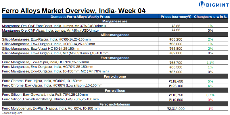 Ferro manganese (HC70%) prices have risen due to constrained supply and increased inquiries from the Southeast region, and a few bulk bookings have been made at the increased price. According to BigMint, ferro manganese offers in Durgapur and Raipur on 25 January ranged from INR 65,500 to INR 65,700/t ($788-$790/t), with an additional INR 700/t ($8/t).