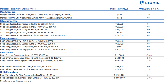 Additionally, HC 75% ferro manganese prices inched up by $1/t w-o-w to $886/t FOB Vizag/Haldia.