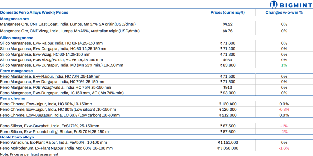Indian silico manganese (60-14) prices remained largely steady with slight rise by INR 200/t ($2/t) w-o-w to INR 71,300-71,600/t ($812-815/t) in Durgapur, Raipur, and Vizag. Prices stayed steady as regular trades continued, steel demand remained weak, and no significant new market inquiries emerged.