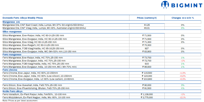 Indian ferro manganese (HC 70%) prices went down by INR 500/t ($6/t) w-o-w to INR 72,700/t ($820/t) exw-Durgapur, however tags also rose by INR 600/t ($7/t) w-o-w to INR 73,700/t ($831/t) exw-Raipur. Durgapur prices dipped on softer local buying, while Raipur increased due to tighter regional supply and slightly stronger procurement.