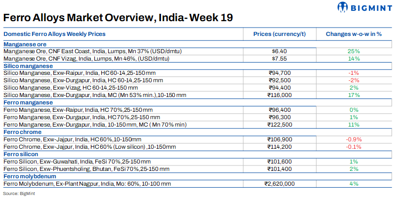Silico manganese prices in India remained largely stable with a slight decline by INR 600/t ($7/t) to INR 92,500-94,700/t ($1,107-1,134/t) exw across major markets of Raipur, Durgapur, and Vizag. This slight decline was noticed because less acceptance was there for high priced materials and lower offers seen from traders. However, a recent high-cost manganese ore import suggests a potential rebound in domestic silico manganese prices.