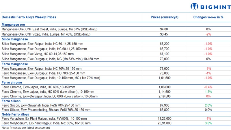 Silico manganese prices fell further with a decline of around INR 900/tonne (t) ($11/t) w-o-w to INR 66,700-67,100/t ($794-799/t) exw in Raipur, Durgapur, and Visakhapatnam. Domestic silico manganese prices in India edged down w-o-w amid falling raw material prices and subdued demand in domestic steel mills.