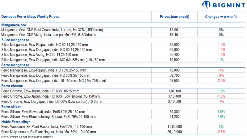 Silico manganese prices edged down by around INR 650/t ($8/t) to INR 65,000-65,500/t ($779-785/t) w-o-w exw in Raipur, Durgapur, and Visakhapatnam. Domestic silico manganese prices have continued to decline w-o-w, with the market facing a prolonged downturn due to reduced trades, shrinking profit margins, and weakening demand.
