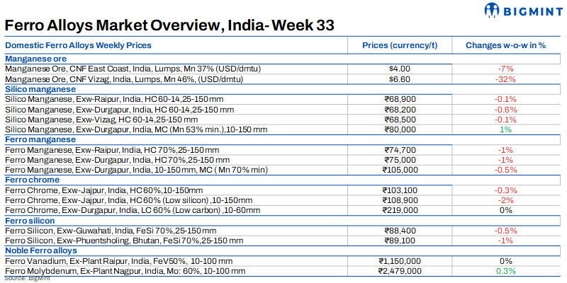 Silico manganese prices remained largely steady w-o-w, inching down by around INR 250/t ($3/t) to INR 68,200-68,900/t ($812-821/t) exw in Raipur, Durgapur and Vishakhapatnam. Domestic silico manganese prices stayed range-bound for another week, driven by cautious buying activity and limited market movement.