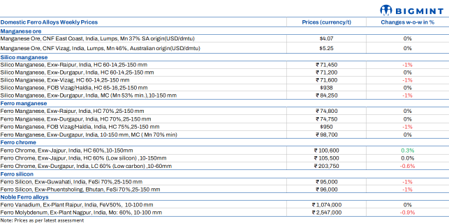 Indian silico manganese prices decreased w-o-w by INR 600/t ($7/t) to INR 71,200-71,600/t ($834-839/t) in the key regions of Durgapur, Raipur and Vizag. Fluctuations in domestic steel prices have led to a slowdown in the silico manganese market due to weaker demand from the steel sector.