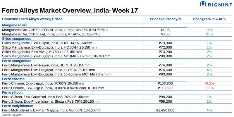 Prices of Indian high-carbon ferro chrome (HC60%, Si:4%) declined by INR 500/t ($6/t) w-o-w on 26 April, settling at INR 107,800/t ($1,293/t) exw-Jajpur. Prices fell after the conclusion of auctions.