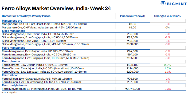 Silico manganese prices in India declined w-o-w by INR 6,650/t ($80/t) to INR 83,000-85,000/t ($993-1,017/t) exw across markets. This price decline came due to subdued demand in the domestic market despite ongoing cost pressure amidst rising imported ore prices.