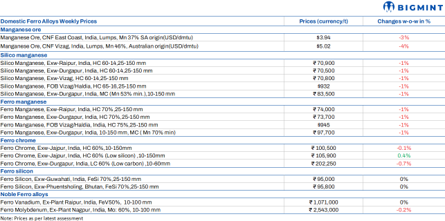 Additionally, HC 75% ferro manganese prices dipped by $13/t w-o-w to $945/t FOB Vizag/Haldia.