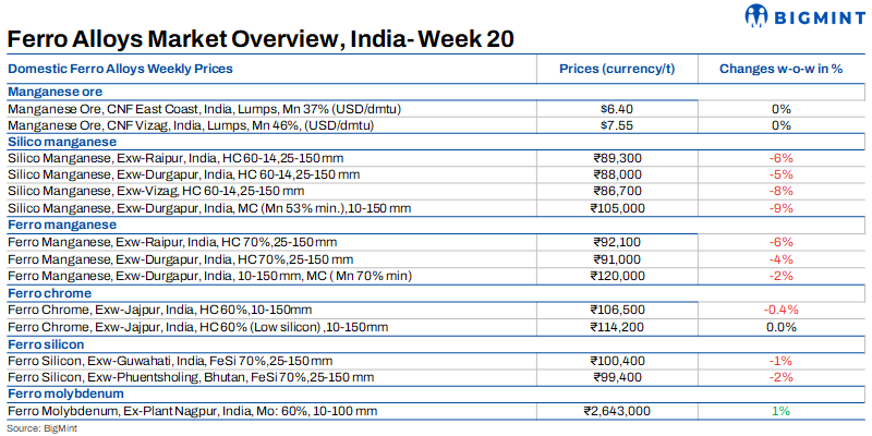 Silico manganese prices in India fell by INR 5,600/t ($67/t) to INR 86,700-89,300/t ($1,041-1,072/t) exw across major markets of Raipur, Durgapur, and Vizag. This surprising downtrend was observed because of need-based buying activity in both domestic and export markets. Given that domestic steel purchasers are moving towards a wait-and-see strategy and avoiding large holdings of manganese alloy material, domestic silico manganese prices might fluctuate in the near future.