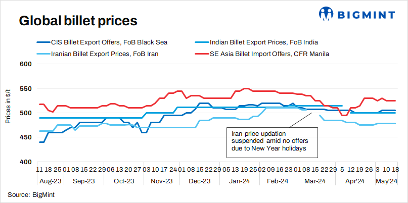 - Iranian billet export prices stay supported: Iranian billet offers remained stable this week. According to BigMint assessment, billet prices stood at $478/t FOB. An Iranian mill has concluded an export tender of 30,000 t of billets at $478/t FOB, sources informed BigMint. The shipment is scheduled for the month of June.