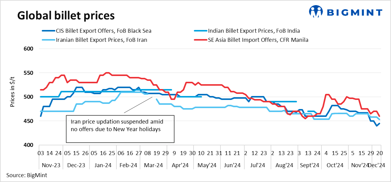 - SE Asia imported billet prices fall w-o-w: Imported billet offers in Southeast Asia fell w-o-w, amid a deteriorating outlook and stagnant demand due to the approaching Christmas holidays. No deals were reported this week, with many buyers adopting a wait-and-watch approach due to price declines in China. Offers for billets (150 x 150 mm, 5SP) imported by the Philippines were heard at around $460-465/t CFR Manila, down $10/t w-o-w on 20 December. Additionally, Japan originated billet were recorded offering at $462/t CFR Manila and offer for China originated billet is at $460/t CFR Manila, source informed BigMint.