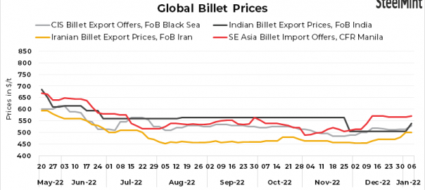 - SE Asia’s imported billet market silent: South East Asia’s imported billet market continued to remain quiet on low buying interest post-New Year as market participants are yet to return from holidays. However, prices for imported billet remained supported this week. SteelMint’s bi-weekly assessment of billet (150x150mm, 3SP) imported by the Philippines currently stands at around $570/t CFR Manila, up marginally by around $4/t w-o-w.